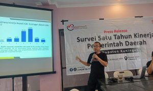 KUNINGAN ONLINE – Direktur Jamparing Research, Topic Offirstson memaparkan hasil survei satu tahun kepemimpinan Bupati dan Wakil Bupati Kuningan periode