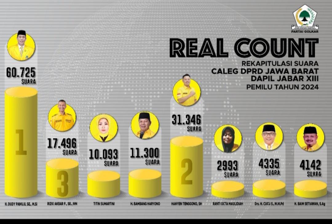 KUNINGAN ONLINE – Pada Pemilu 2024 sekarang, Partai Golkar untuk DPRD Provinsi dapil Jabar 13 mengamankan satu kursi. Berdasarkan realcount rekapitulasi pleno tingkat kecamatan di Kabupaten Kuningan, Ciamis, Banjar, Pangandaran kursi tersebut bakal diduduki oleh Caleg incumbent H. Dudy Pamuji.