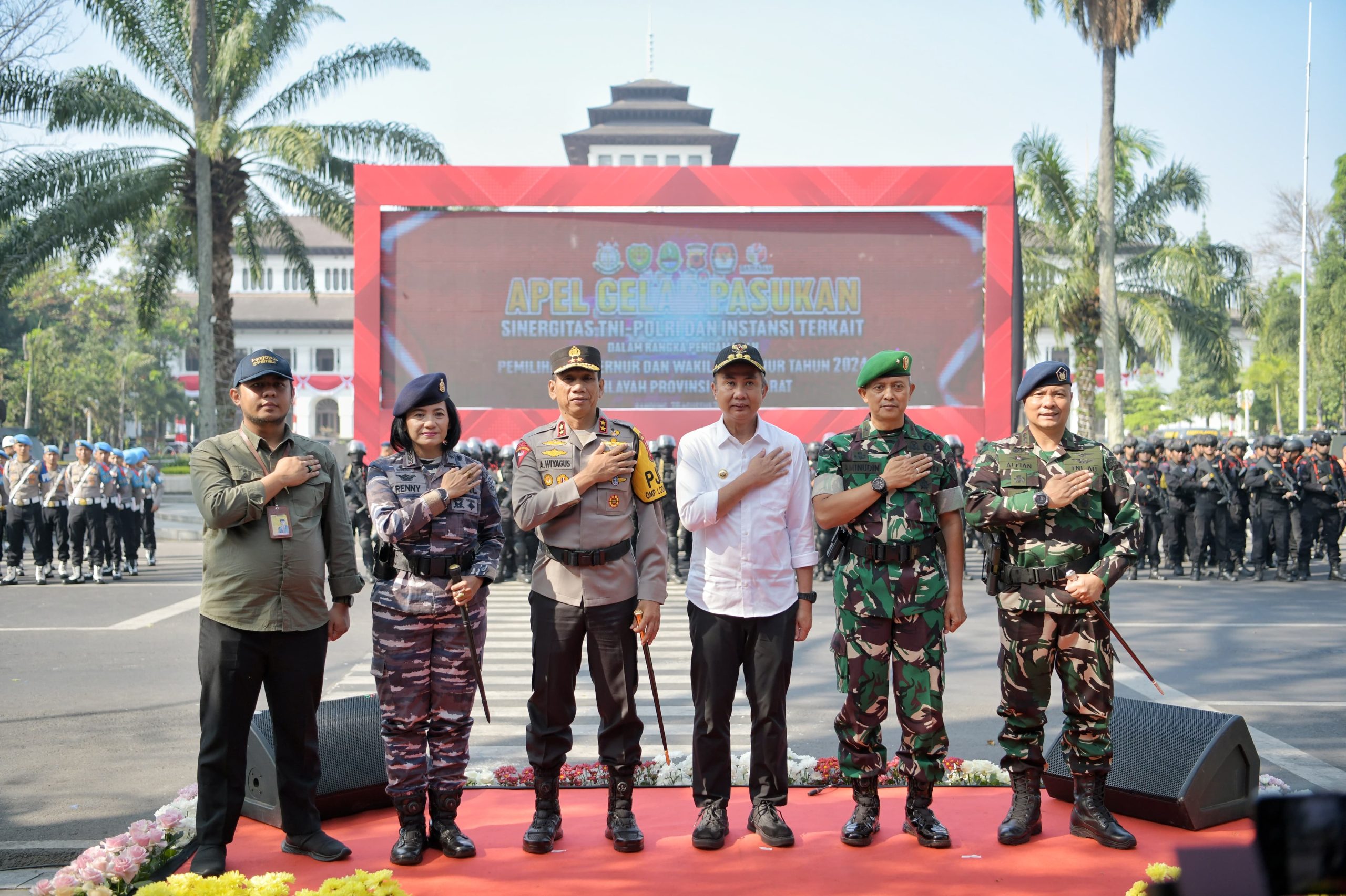 Kegiatan apel berlangsung secara hibrida di depan Gedung Sate, di ruas Jalan Diponegoro, Kota Bandung, dan juga melalui sambungan konferensi video, diikuti unsur Forkopimda Jabar, elemen TNI/Polri, KPU, Bawaslu, serta stakeholders lainnya baik di tingkat provinsi maupun kabupaten/kota, Selasa (20/8/2024).