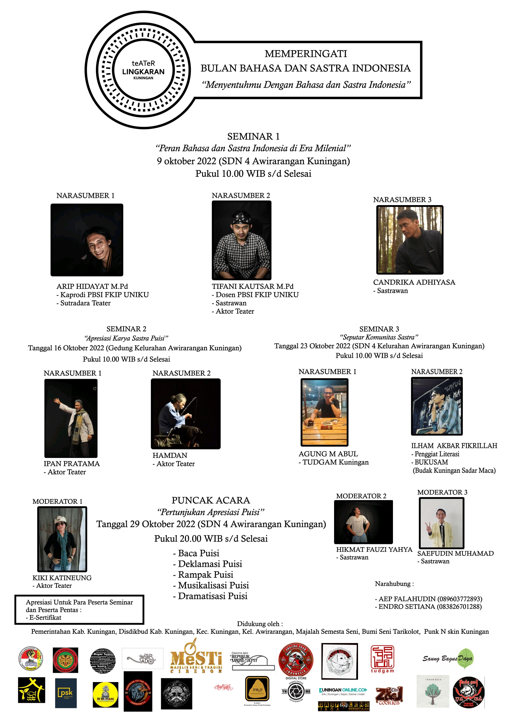 “Dari latar belakang tersebut kami Teater Lingkaran Kuningan yang berdomisili di Awirarangan mengagas kegiatan memeringati bulan bahasa dan sastra indonesia dengan tema Menyentuhmu Dengan Bahasa dan Sastra Indonesia,” ujar Ketua Teater Lingkaran Kuningan, Endro Setiana, Minggu (16/10/2022).
