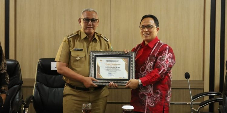 KUNINGAN ONLINE – Komisi Pemilihan Umum (KPU) Provinsi Jawa Barat memberikan piagam penghargaan atas dukungan penyelenggaraan sosialisasi tahapan pemilu 2024 kepada Bupati Kuningan Acep Purnama.