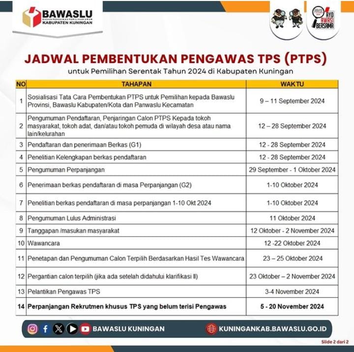 KUNINGAN ONLINE – Badan Pengawas Pemilihan Umum (Bawaslu) Kabupaten Kuningan telah membuka rekrutmen untuk posisi Pengawas Tempat Pemungutan Suara (TPS) pada pemilihan Gubernur, Wakil Gubernur, Bupati, dan Wakil Bupati yang akan digelar serentak pada 27 November 2024.