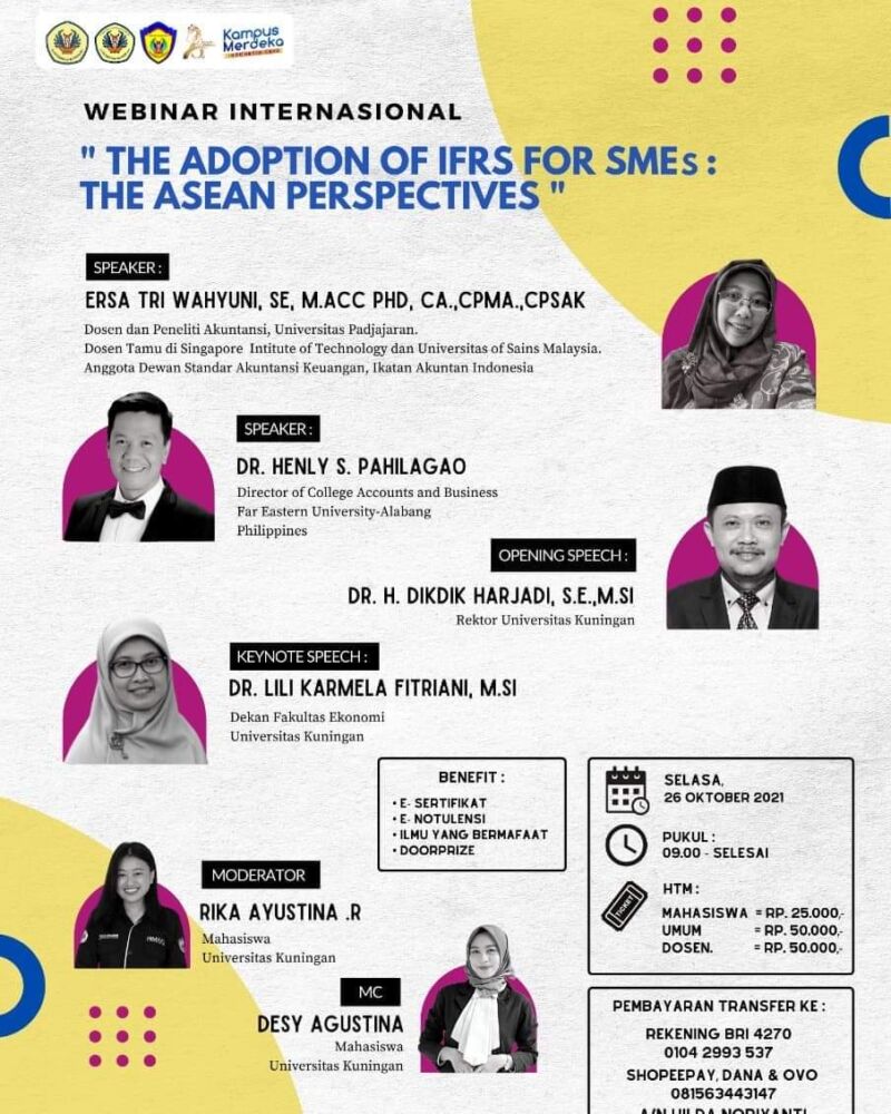 Kegiatan yang akan dilaksanakan melalui aplikasi Zoom Meeting secara daring pada tanggal 26 Oktober 2021 mendatang itu dengan menghadirkan narasumber Ersa Tri Wahyuni, SE., M.ACC Ph.D., CA., CPMA., CPSAK., (Dosen Akuntansi Universitas Padjadjaran dan Anggota Dewan Standar Akuntansi Keuangan (DSAK) Ikatan Akuntan Indonesia (IAI)) dan Dr. Henly S Pahilagad (Director of College Accounts and Business Far Eastern University Alabang Philippines), sebagai bentuk edukasi Prodi Akuntansi dan Himpunan Mahasiswa Akuntansi (Himaku) Fakultas Ekonomi (FE) Universitas Kuningan (Uniku) kepada masyarakat, baik dalam negeri maupun luar negeri terkait IFRS SMEs dan implementasinya dalam perspektif ASEAN.