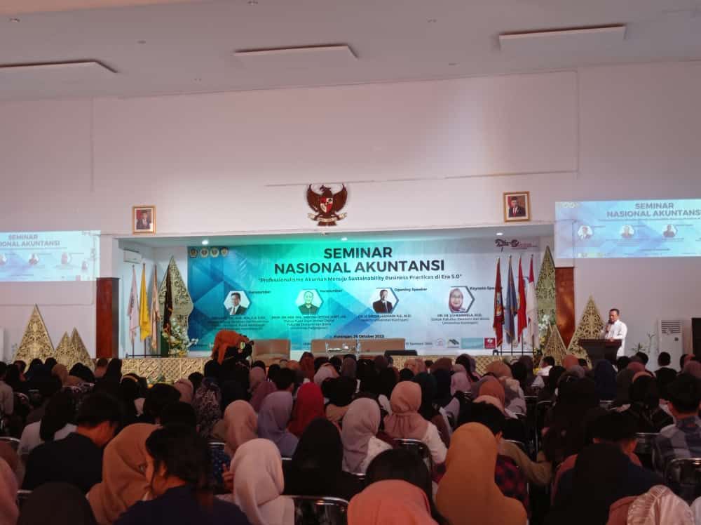 Seminar Nasional tersebut mengusung tema “Professionalisme Akuntan Menuju Sustainability Business Practices di Era 5.0”. Sekaligus memperingati Dies Natalis Prodi Akutansi yang ke-27.