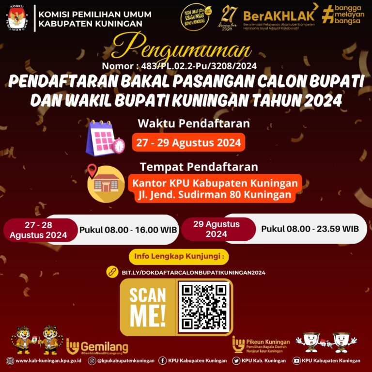 KUNINGAN ONLINE – Komisi Pemilihan Umum (KPU) Kabupaten Kuningan mengumumkan bahwa pihaknya siap menerima pendaftaran bakal calon bupati dan wakil bupati dalam pemilihan kepala daerah (Pilkada) serentak tahun 2024.