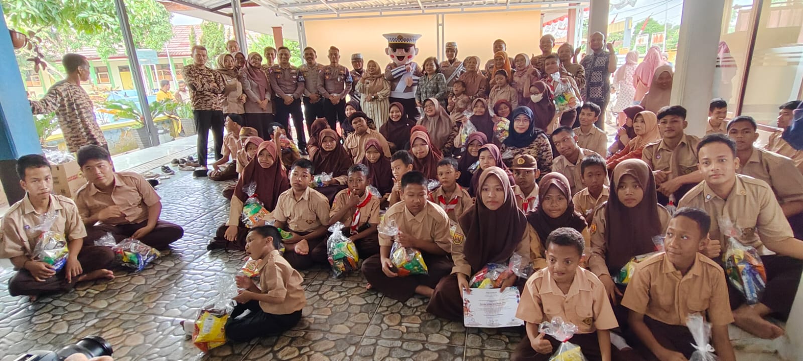 Tawa mereka begitu lepas ketika boneka polisi mengajak berjoget bersama dan berbagi bingkisan makanan kepada para siswa.