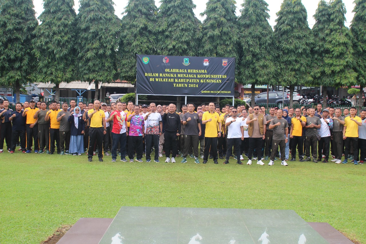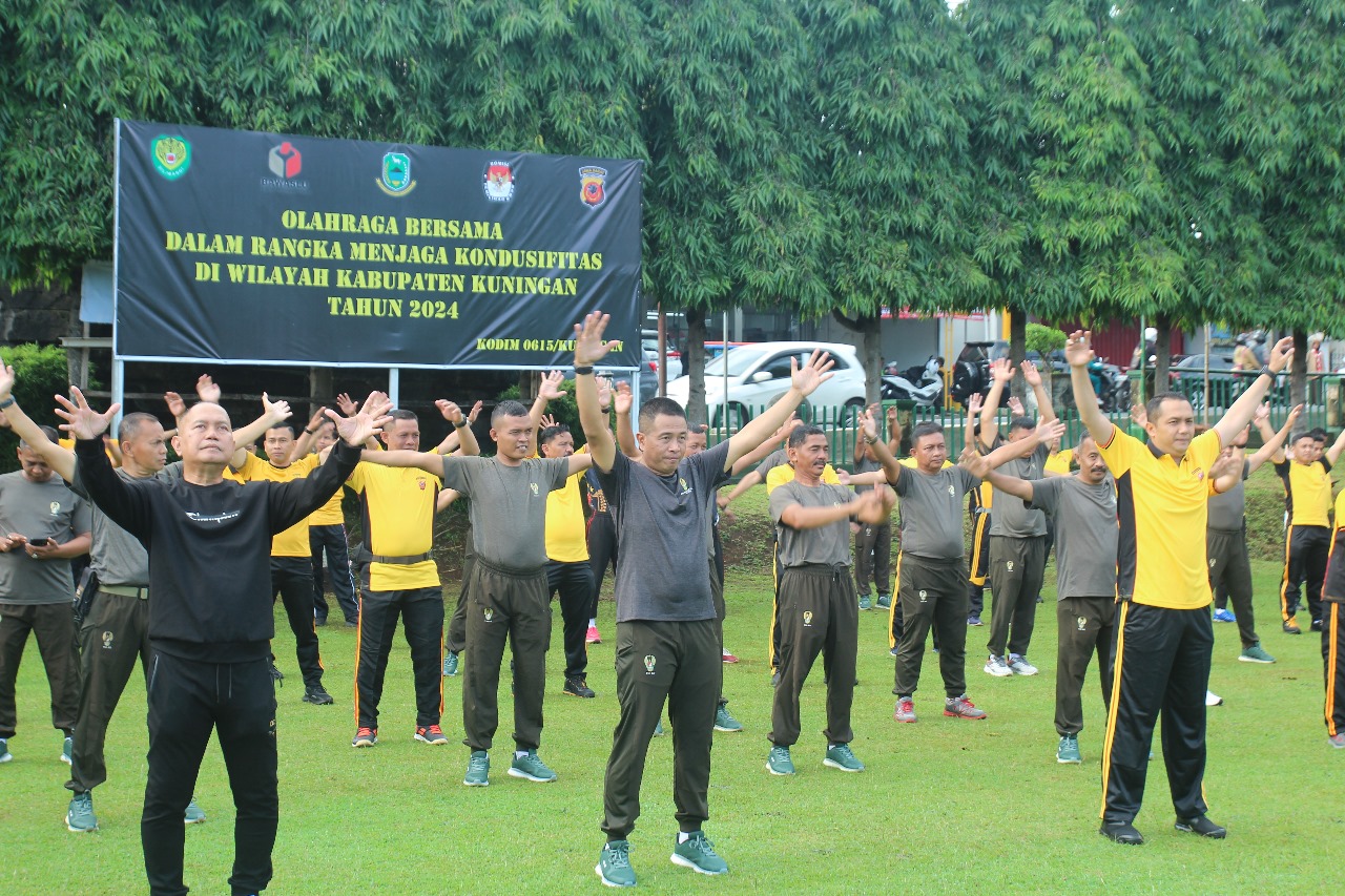 KUNINGAN ONLINE – Dalam rangka menjaga kondusifitas menjelang Pemilu 2024, Kodim 0615/KNG dan Polres Kuningan menggelar olahraga senam bersama, di Halaman Makodim 0615/KNG, Jumat (2/2/2024).