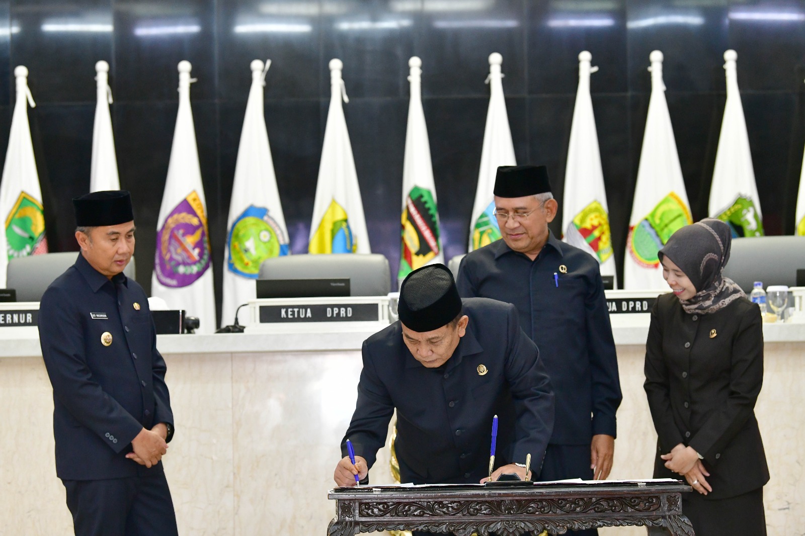 JABAR ONLINE, BANDUNG – Penjabat Gubernur Jawa Barat Bey Machmudin dan Pimpinan DPRD Jabar menandatangani Nota Kesepakatan Perubahan Kebijakan Umum Anggaran (KUA) dan Prioritas Plafon Anggaran Sementara (PPAS) Tahun Anggaran 2024 dalam Rapat Paripurna DPDR Jabar di Kota Bandung, Rabu (14/8/2024).