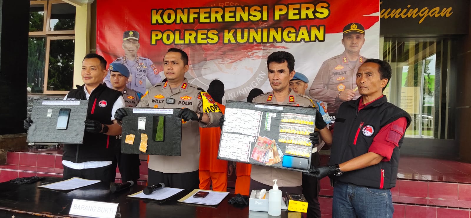 Kapolres Kuningan, AKBP Willy Andrian didampingi Kasat Narkoba AKP Udiyanto saat memberikan keterangan persnya, Selasa (16/1), menjelaskan, selama Januari 2024 petugas kepolisian berhasil membekuk tiga pelaku tindak pidana narkoba. Ketiganya merupakan warga Kabupaten Kuningan dengan masing-masing berinisial NS, PBL, dan SM.
