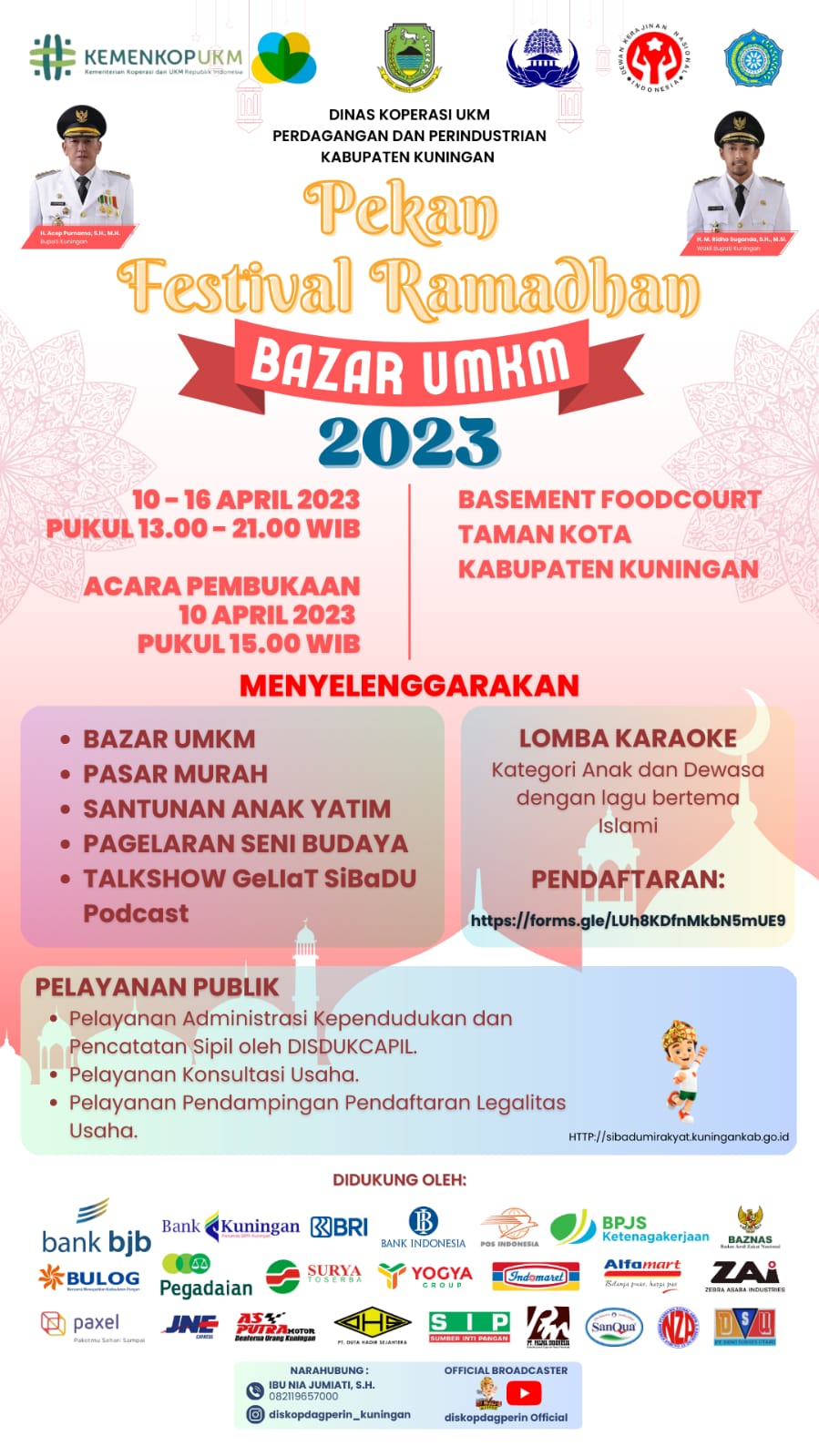 Kegiatan Pekan Festival Ramadhan dan Bazar UMKM Tahun 2023 merupakan salah satu dukungan/partisipasi Pemerintah Kabupaten Kuningan dalam rangkaian acara Bulan Suci Berbagi On The Street (BUBOS7) Tahun 2023 yang akan diselenggarakan serentak di 27 Kabupaten/Kota dengan mengusung tema Bertasbih (Berbagi Cinta Berkah dan Kasih) serta mengusung konsep Pesta Rakyat, Pasar Murah, Berbagi Berkah dan Bazar Ramadhan. (OM)