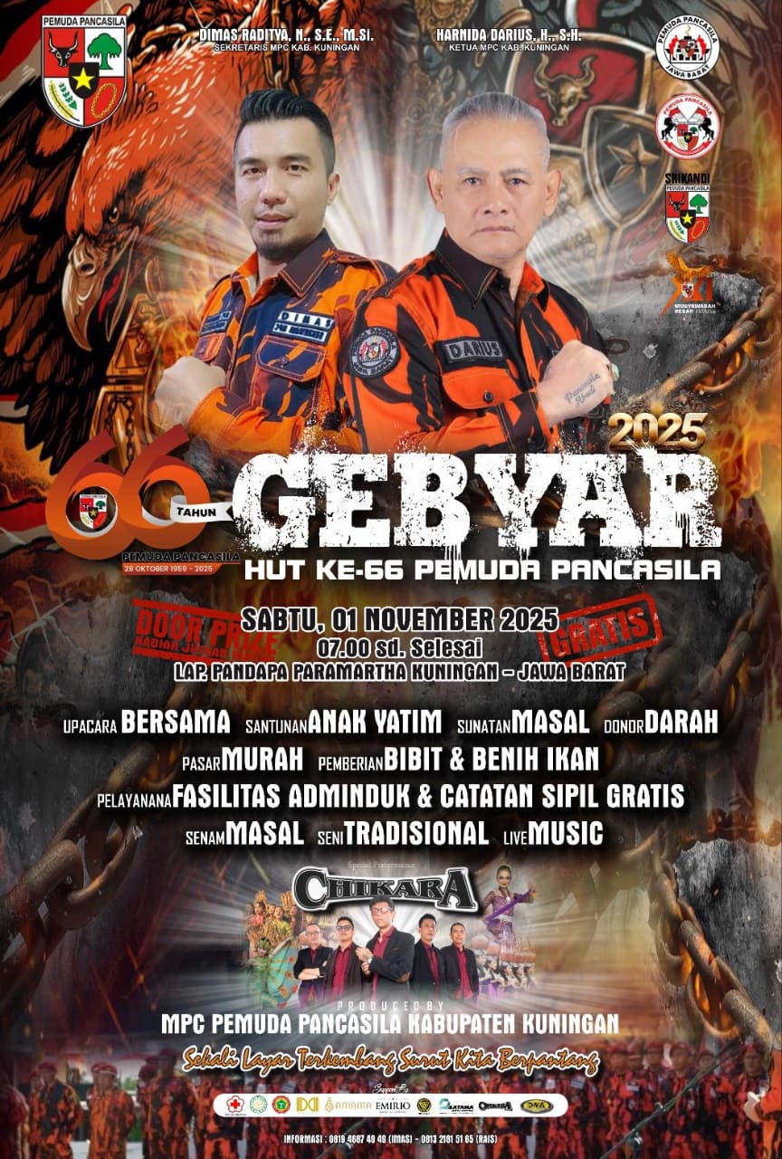 KUNINGAN ONLINE – Dalam rangka memperingati Hari Ulang Tahun ke-66 Pemuda Pancasila, Majelis Pimpinan Cabang (MPC) Pemuda Pancasila Kabupaten Kuningan akan menggelar Gebyar HUT Pemuda Pancasila pada Jumat, 1 November 2025, bertempat di Pandapa Paramarta Kuningan.