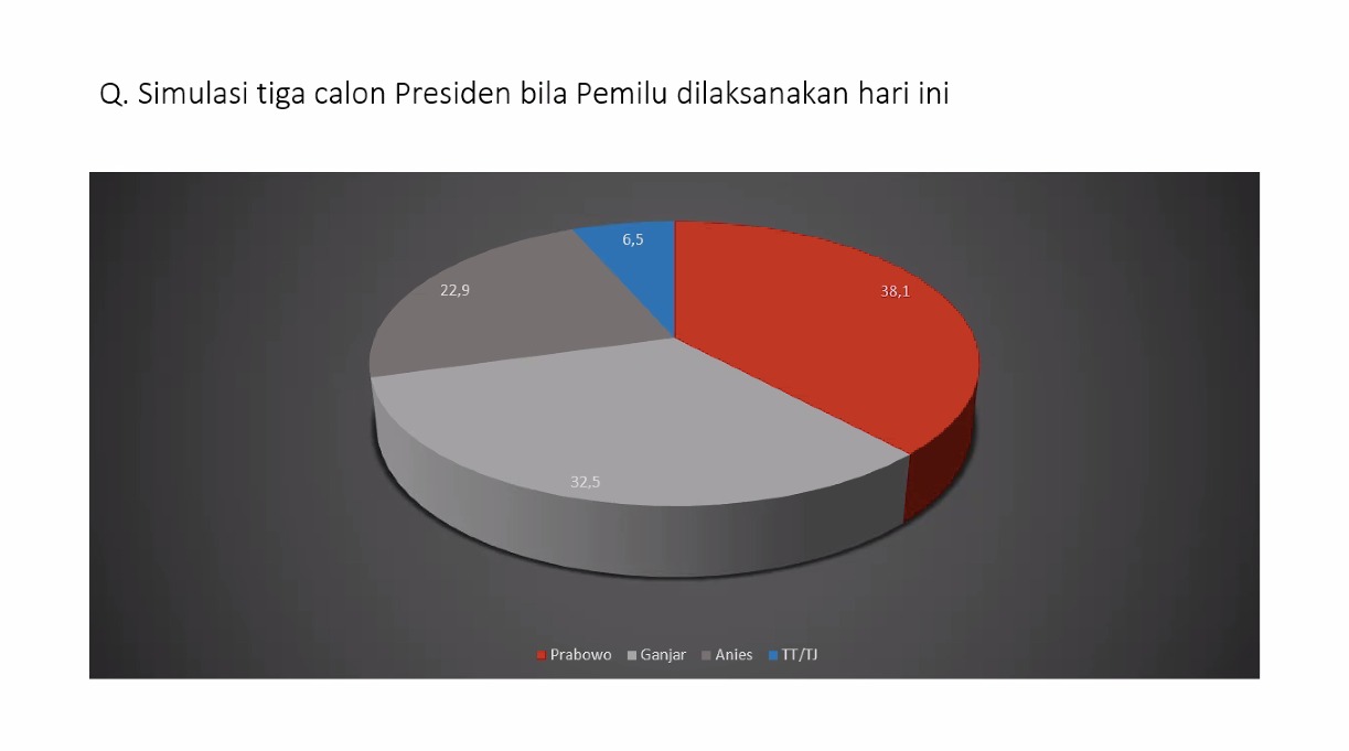 “Prabowo masih memuncaki tingkat elektabilitas tertinggi bila Pilpres dilaksanakan hari ini dengan perolehan persentase 32,9%,” ujarnya.