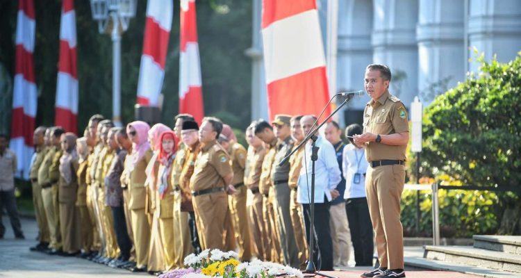 JABAR ONLINE, BANDUNG – Penjabat Gubernur Jawa Barat Bey Machmudin menjadi pembina apel pagi di lingkungan Sekretariat Daerah dan Badan