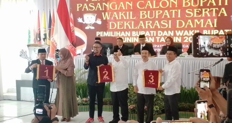 KUNINGAN ONLINE – Komisi Pemilihan Umum (KPU) resmi melaksanakan pengundian nomor urut bagi ketiga pasangan calon bupati dan wakil bupati