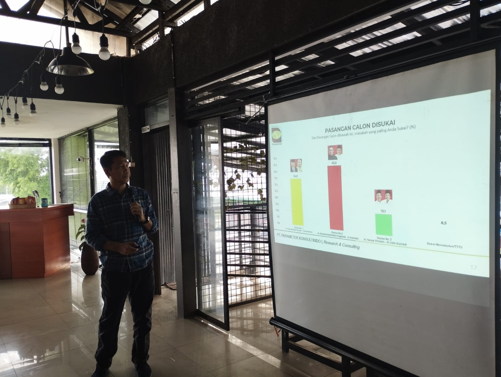 Direktur PT Parameter Konsultindo, Dr Agus Aribowo dalam keterangan resminya menyampaikan, bahwa elektabilitas Paslon 02 Ridhokan saat ini mencapai 43,8%. Sedangkan Paslon 01 Dirahmati yang berada di angka 35,1% dan Paslon 03 Hatiku dengan 12,8%.