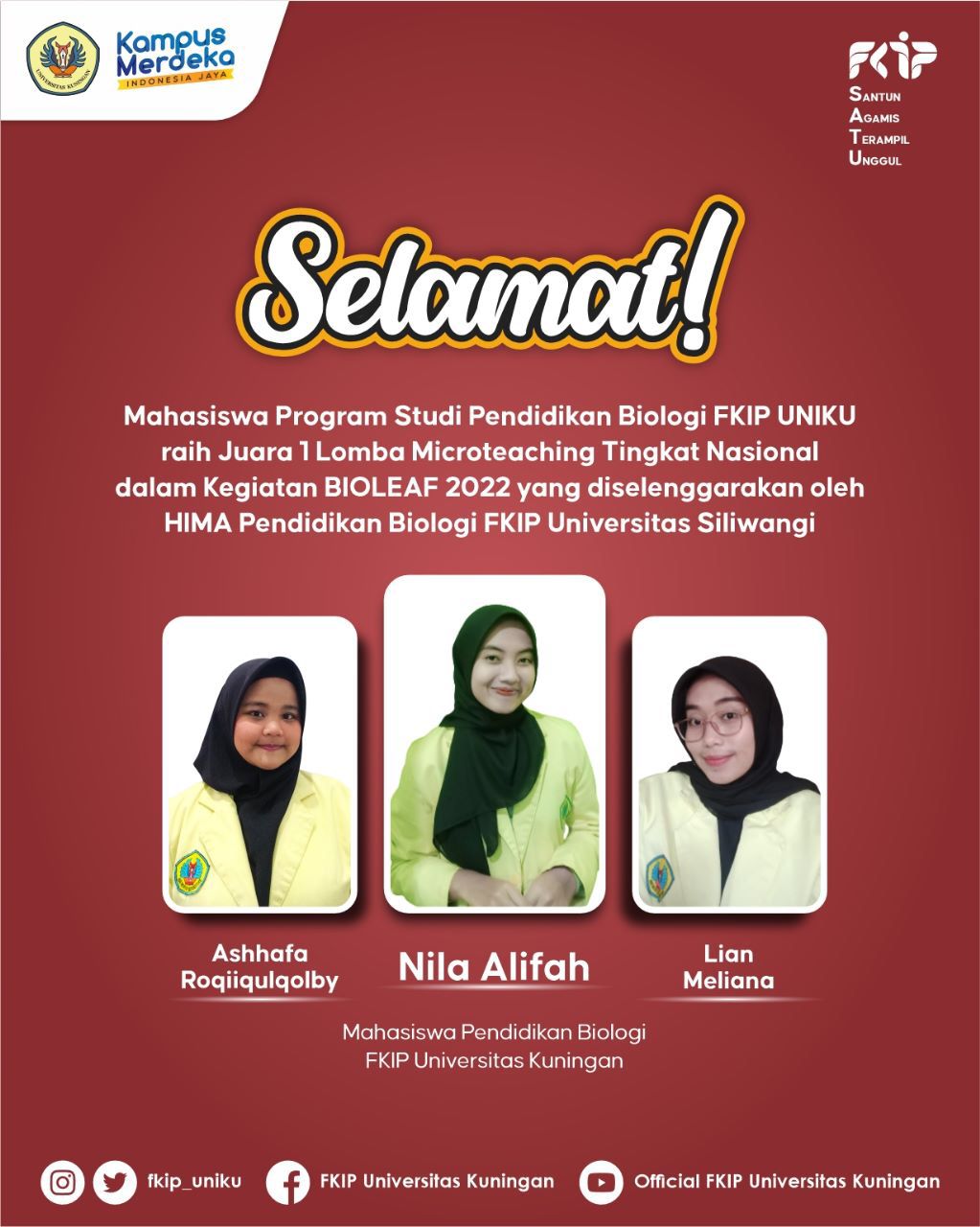 “Baru kemarin salah satu mahasiswa dari Prodi Pendidikan Matematika berhasil torehkan prestasi nasional, kali ini giliran mahasiswa Prodi Pendidikan Biologi yang torehkan prestasi nasional. Raihan prestasi ini mengharumkan nama Prodi Pendidikan Biologi (PBio) FKIP khususnya maupun umumnya Universitas Kuningan (Uniku) di kancah nasional,” tambahnya