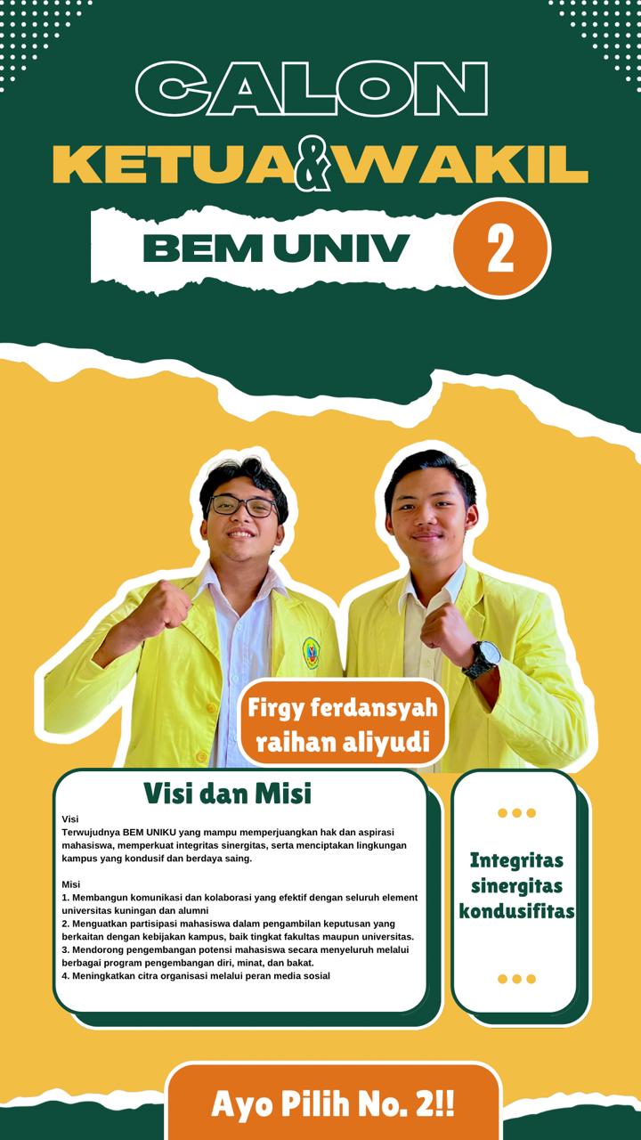Kami, pasangan calon Presiden Mahasiswa Universitas Kuningan Nomor Urut 02 , hadir dengan visi besar: “Membangun Sinergi, Mengukir Prestasi”. Kami percaya bahwa kemajuan Universitas Kuningan tidak hanya bergantung pada individu, tetapi pada kekuatan kolaborasi antara seluruh elemen organisasi mahasiswa.